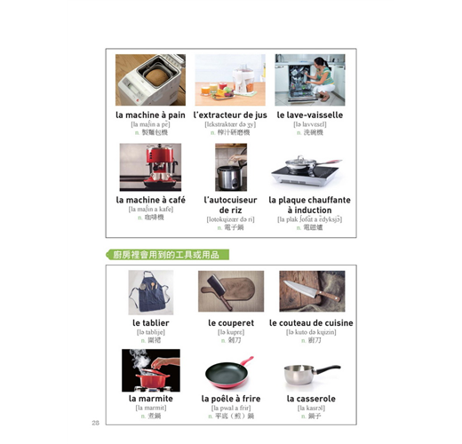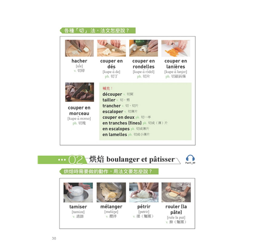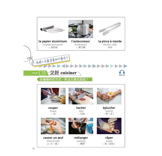 目前台灣的法語教學教材雖然都能教你應付生活中大方向用的到的法文,但單字量往往不夠大量、分類不夠詳細,而且通常沒有圖片做對照,只能單靠文字來想像。例如:關於料理的法文,一開始會學到「煮」的單字是「faire cuire」,若想進一步表達「預熱、炒、燙、翻炒、煎」等,以目前的學習,你能精準描述嗎?或是西式料理常用來提味的「迷迭香」「羅勒」「百里香」「月桂葉」,從中文字面意義,你能夠分辨得出其實際長相嗎?傳統的學習方式讓你好像學了不少,但生活中會用到的單字卻總是零零落落,這個不知道、那個不清楚。