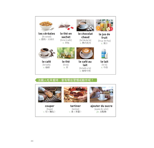 本書依照地點收錄 11大章節,超過30個地點或場合,從廚房、地鐵站、超級市場到咖啡館等等,讓你像是走進了巴黎的咖啡館一樣,如臨現場、身歷其境學到各類主題的法語,你想知道的咖啡、麵包、早餐、甜點等最具代表性的主題單字、文化介紹都有收錄。從此徹底知道要怎麼用法語說出身邊的人事物,舉目所及、親身經歷的一切都成為你的法語老師,走到哪裡法語教室就在哪裡!