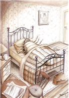 他的房間雖嫌小了些,但還是人住的房間,靜置在四面熟悉的牆壁之間。桌上擱著布料樣品,攤開沒有包好—撒摩札是布料推銷員—桌前的牆上掛著一幅畫,那是他最近從圖畫雜誌上剪下來的...
