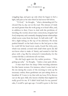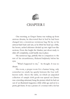 “What's happened to me,” he thought. It was no dream. His room, a proper room for a human being, only somewhat too small, lay quietly between the four wellknown walls. Above the table, on which an unpacked collection of sample cloth goods was spread out (Samsa was a traveling salesman) hung the picture which he had cut out of an illustrated magazine a little while ago and set in a pretty gilt frame. It was a picture of a woman with a fur hat and a fur boa. She sat erect there, lifting up in the direction of the viewer a solid fur muff into which her entire forearm disappeared.