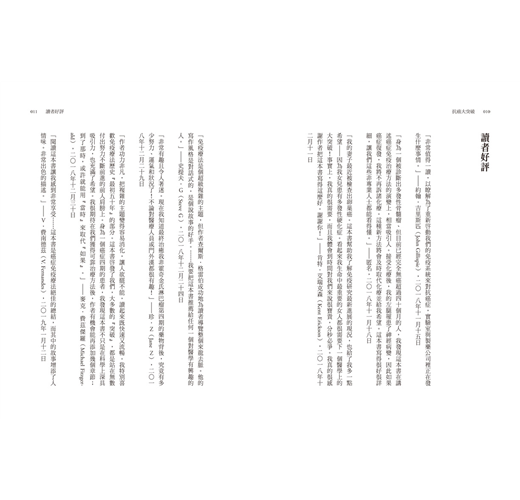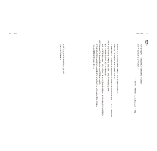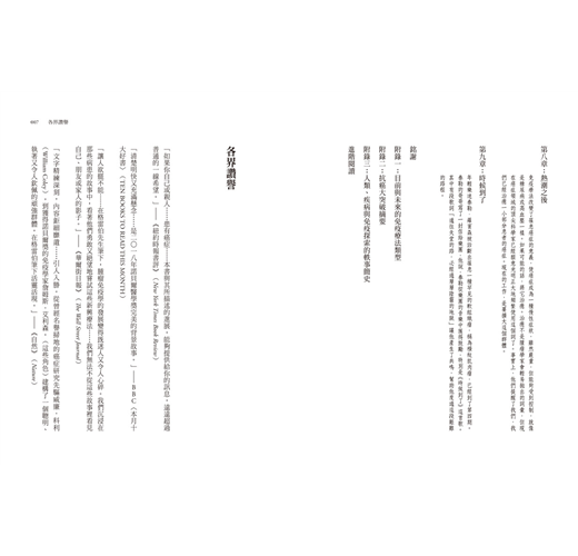 「作者功力非凡,把複雜的主題變得容易消化,讓人欲罷不能,讀起來既快速又流暢。我特別喜歡免疫療法歷史『最初五十年』的部分。這本書啟發了我們,大多數的『突破』,都是站在無數付出努力不斷前進的前人肩膀上。