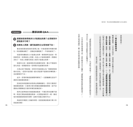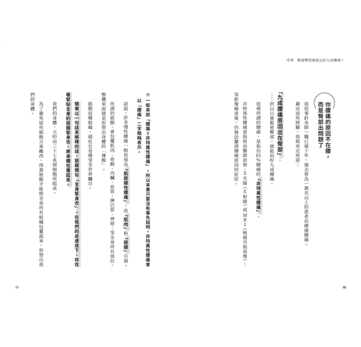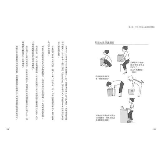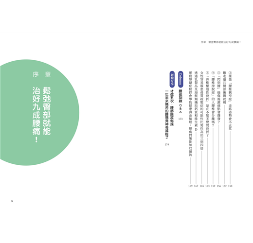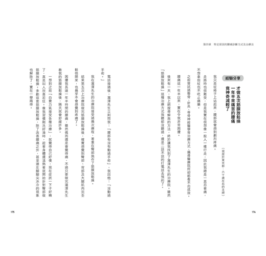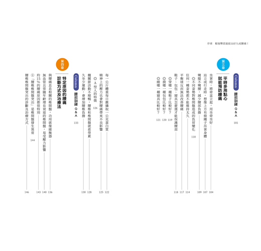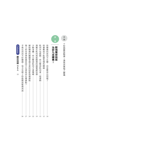 除了每日筋膜放鬆操,作者更提出日常裡的自我檢視,告訴你正確的身體使用方式、如何習慣對的坐姿站姿與搬物姿勢,怎麼挑選鞋子包包寢具來保護腰部、飲食注意…等,讓腰痛從此遠離你。