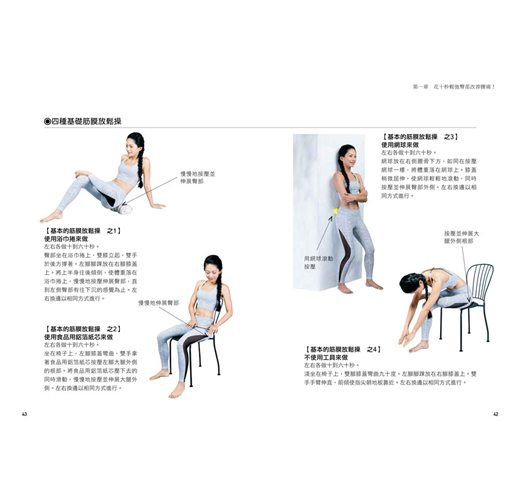 筋膜放鬆操可以徒手做,或運用日常素材,例如:浴巾、雜誌、鋁箔紙芯…等做簡易輔具,每天早晚只要做一次、單一部位練十秒,不適狀況就能逐漸改善,肌肉和筋膜每日感受到的新壓力才不會一直累積。放鬆筋膜之餘,還能同時改善駝背、小腹突出、身體單側歪斜帶來的疼痛,一舉數得。