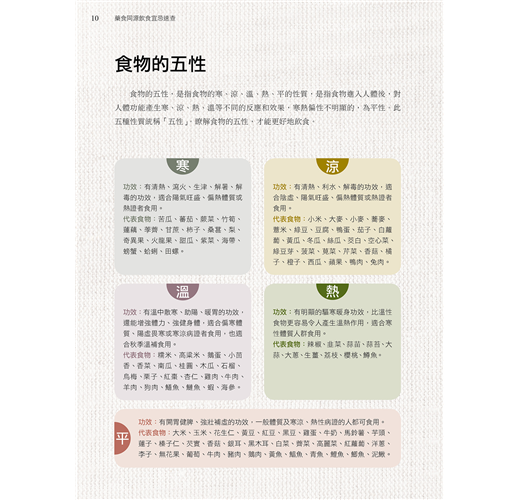 本書重點介紹了大家常見,又具有極高營養價值的食物,包括蔬菜、水果、堅果、穀物、肉類、水產、中藥等,基本涵蓋了我們日常飲食的種類。除了介紹每種食物的營養成分,還提供了各自的搭配宜忌、飲食宜忌及保健功效、烹飪竅門等。此外,還推薦了身體調養,常見疾病調養,不同人群、四季的飲食宜忌,讓大家能根據自己和家人的身體狀況選擇適合的食物,趨宜避忌,更好地調理身體。