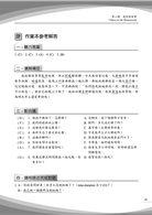 4. 作業本的參考解答:除漢字練習外,作業本另有六到八個練習題型,並就各部分提供參考答案,以方便教師批改作業。