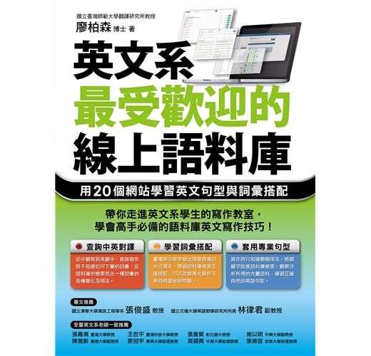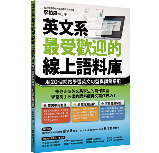 專文推薦(擷取部分) 國立清華大學資訊工程學系教授 張俊盛 很遺憾的是,大數據語言學習工具的福音,沒有普遍傳播。大家都知道可以用Google搜尋資訊,但只有少數人知道搜尋語言用法,有許多特別設計的免費工具可資利用,效果優於Google。很多教師、學子無緣享受這些很好用的服務帶來的益處,相當可惜。 我很高興知道廖教授寫了這本新書,推薦20多個全世界頂尖的語言學習網站。我相信本書對於學生、老師、文職、工程師等形形色色的讀者,會有很大的幫助。藉著大數據工具的力量,在課堂之外,沒有老師從旁指導,憑藉工具,就能得「語言之道」,解「語言之惑」。 全球化腳步加快之際,所幸有廖教授介紹的這些工具可運用,隨時都可用以快速解決問題,改進英文寫作,以溝通全世界。廖教授的這本書,相信可有效地推廣「資料密集式語言學習」的觀念與實務。如果說本書可助一臂之力,幫國家提升全球競爭力,也不為過。因此,我很樂意推薦本書,是為序。 國立交通大學英語教學所所長暨語言教學與研究中心主任 林律君 廖教授在本書中介紹了20個常見也容易操作的語料庫,提供想用英文寫作的讀者「善其事、利其器」的寫作工具。針對其中10個語料庫,提供詳盡的介紹與清楚的檢索步驟,每章節後還設計了綜合練習,並提供參考答案,幫助學習者可以透過實際操作與練習,「知其然,亦知其所以然」,達到自主學習的成效。 在大數據的時代,AI人工智慧浪潮下,所有的學習欲善其事,必先利其器;達到知其然(工具),並知其所以然(如何、為什麼使用)。用大數據語料庫及有效的檢索方法學英文,方可借力使力,事半功倍。廖教授的這本書正提供了英文寫作者所需要的知識與方法,本人很榮幸能撰文推薦。