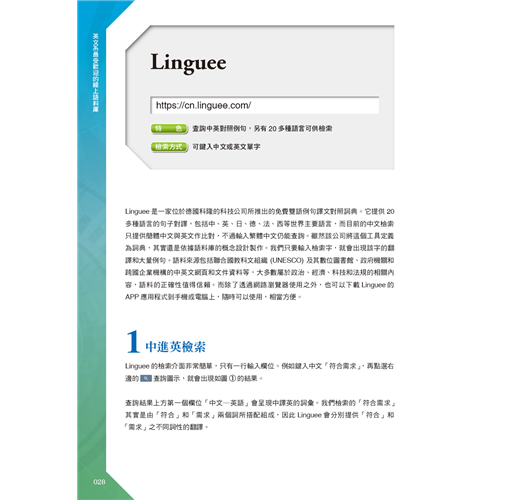 推薦序 推薦序 前言 語料庫介紹 10大英文寫作語料庫 1. 國教院華英雙語索引典系統 2. Linguee 3. Online Collocation Dictionary(線上搭配詞典) 4. JTW (Just the Word) 5. FRAZE.IT 6. Google學術搜尋 7. Netspeak 8. Linggle 9. Ludwig 10. COCA (Corpus of Contemporary American English)(現代美式英文語料庫) 其他常用線上語料庫 1. TANGO 2. CARE (Concordancer for Academic Written English)(學術寫作英文檢索) 3. 臺灣法律資料中英對照語料庫 4. 傳譯資源網:中英雙語時事詞彙 5. VoiceTube查詢單...