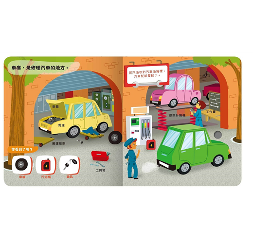 「車庫是修理汽車的地方。汽車發動的聲音是怎樣的呢?聽聽看!車輪,汽油桶,鑰匙在哪裡呢?找找看!」
