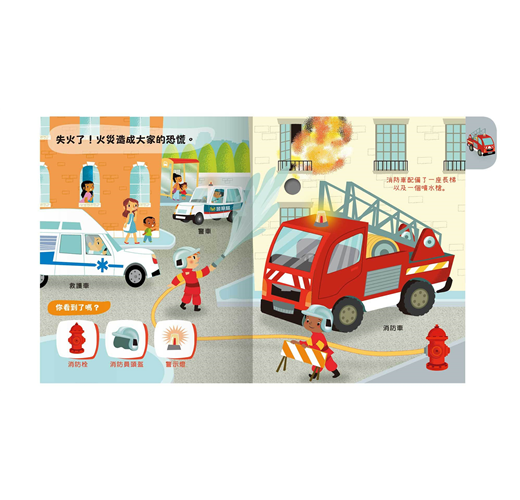 「失火了!火災造成大家的恐慌。 消防車警報器的聲音是怎樣的呢?聽聽看!各式消防設備在哪裡?找找看!」