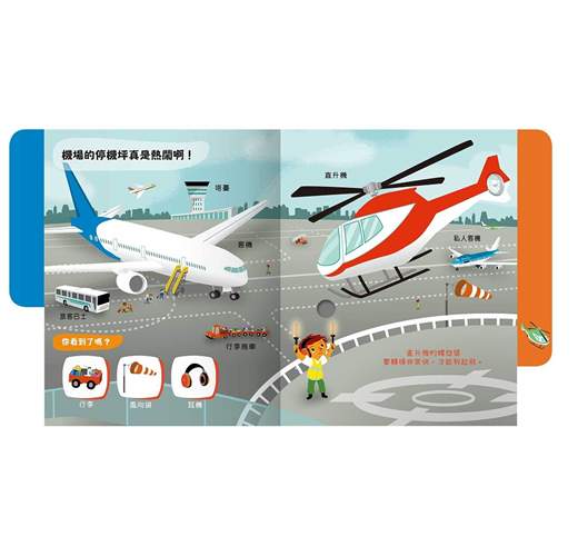 「機場的停機坪真是熱鬧啊!直升機螺旋槳的聲音是怎樣的呢?聽聽看!行李,風向袋在哪裡呢?一起找找看!」