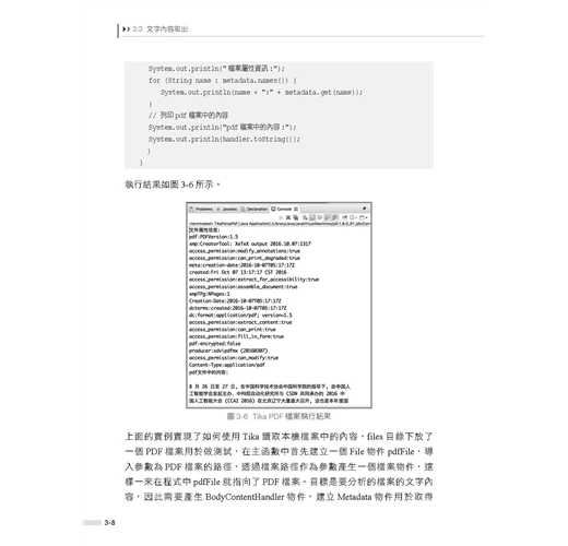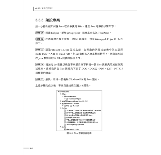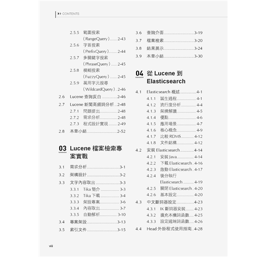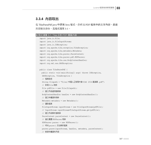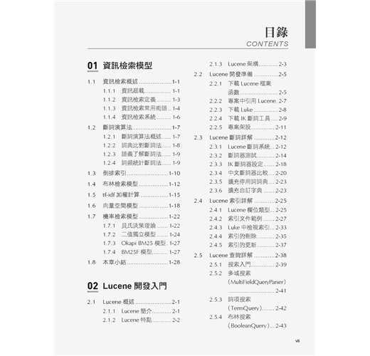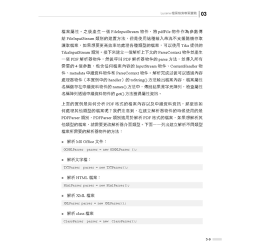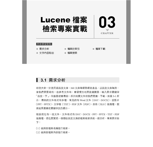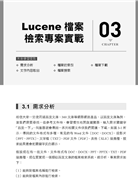 ■ 第3章是Lucene專案實戰部分,介紹如何使用Lucene建置一個檔案檢索系統,內容包含專案的整體設計、使用Tika做資訊取出、索引的建置、使用者查詢介面的設計與實現、使用者查詢處理、搜索結果展示等內容。