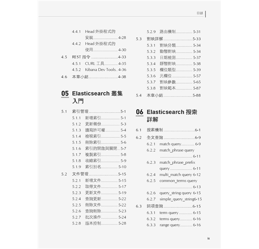 ■ 第5章是Elasticsearch叢集入門,主要內容包含索引管理、文件管理和對映詳解。