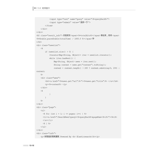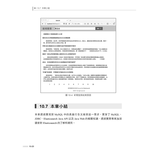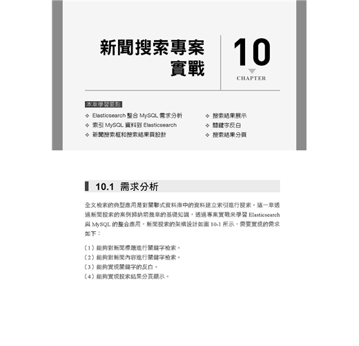 ■ 第10章是Elasticsearch整合MySQL專案實戰部分,透過實現對MySQL中的資料進行全文檢索這一需求,貫穿了MySQL、JDBC、Elasticsearch Java API以及Java Web的相關知識,讓讀者了解在實際的專案開發中使用Elasticsearch做全文檢索搜尋的方法。