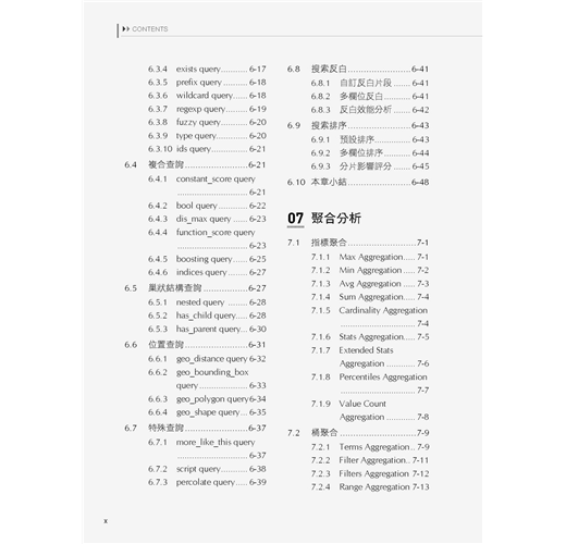 ■ 第6章介紹Elasticsearch的搜索功能,主要內容包含搜索機制的解讀、全文查詢、詞項查詢、複合查詢、巢狀結構查詢、位置查詢、特殊查詢、搜索反白和排序。