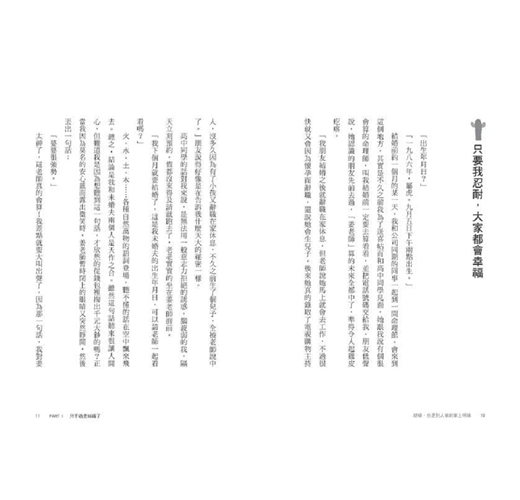 作者想到了自己母親,身為傳統好媳婦的她,這一輩子的付出都被視為理所當然,卻未曾被感謝。「如果我過得像媽媽一樣的話,她一定會很心痛的。」在面對種種不合理後,作者決心改變,不再事事順從。