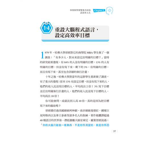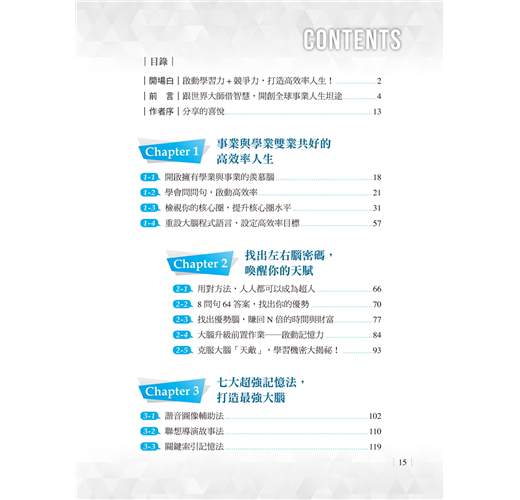 擁有暢遊43國的豐富閱歷,與近20年的落地教學實力,海內外受邀演講達上萬場,受惠人數達25萬人次,已有2萬名學生完成高強度效能訓練,受訓學員年齡層廣泛,遍及各行各業,更有多本關於學習力的暢銷書著作,影響讀者無數。