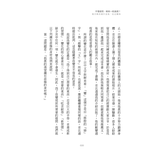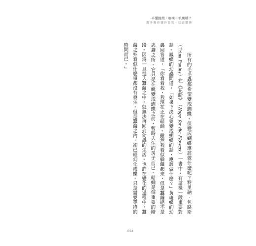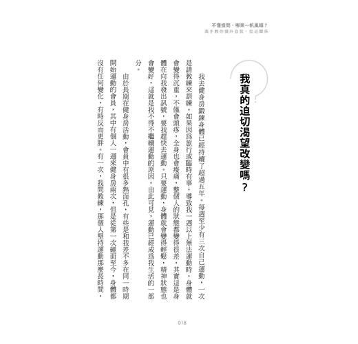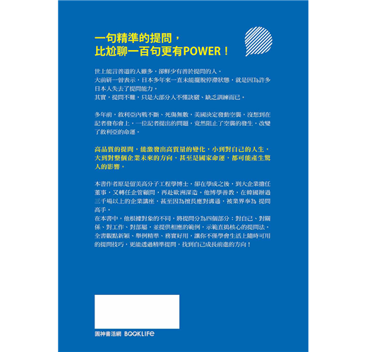 書中他根據對象的不同,將提問分為四個部分:對自己、對關係、對工作、對部屬,並提供相應的範例,示範高手的直搗核心提問法。全書觀點新穎、舉例精準,務實好用,讓你不僅學會生活上隨時可用的提問技巧,更能透過精準提問,找到自己成長前進的方向!