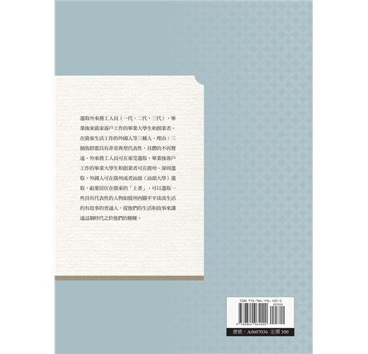 選取外來務工人員(一代、二代、三代),畢業後來廣東落戶工作的畢業大學生和創業者,在廣東生活工作的外國人等三種人。理由:三個族群都具有非常典型代表性,具體的不再贅述。外來務工人員可在東莞選取,畢業後落戶工作的畢業大學生和創業者可在廣州、深圳選取,外國人可在廣州或者汕頭(汕頭大學)選取。祖輩居住在廣東的「土著」,可以選取一些具有代表性的人物如廣州西關平平淡淡生活的有故事的普通人,從他們的生活和故事來講述這個時代之於他們的種種。