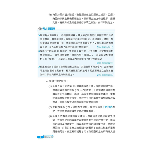 另外土地法規考題可能出普通法與特別法數種法規如何適用的題型,例如平均地權條例與土地法及土地徵收條例出現在同一題型。命題者旨在測試考生基礎是否扎實,不會誤用法規,以及不同條文間綜合理解、運用的能力。所以練習題目時應特別聚焦在法規適用順序上。