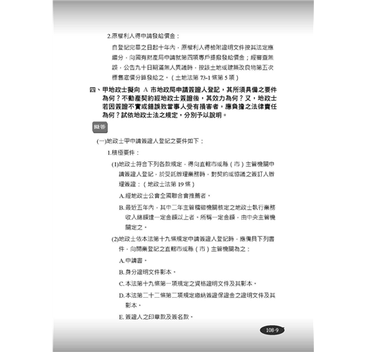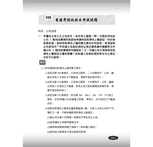 本次改版亦增加108年地政士普通考試試題及擬答,幫讀者追蹤最新年度的考題趨勢變化。