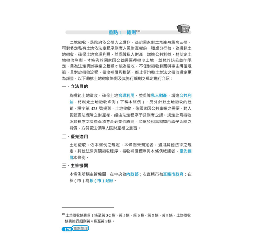 本書深入淺出整理土地相關法規(土地法及施行法、平均地權條例及其施行細則、土地徵收條例及其施行細則、地政士法及倫理法規),將不必要、繁雜的資訊去除,只留下會考的、能考的及必考的重點,幫讀者減少閱讀障礙。先土地法,後特別法,規範重疊處依次釐清,降低混淆機率。