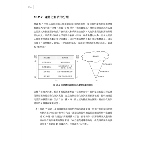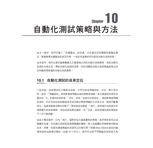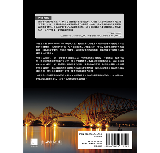 本書分三個部分。第一部分作者根據自己近十年的工作及諮詢經歷,不斷總結、提煉和反思,對原有的持續交付進行了修正,重新定義持續交付為實作戰略目標的能力,並引入持續交付的能力模型;第二部分闡述打造持續交付能力所需遵守的原則,包括基礎原則、組織原則和架構原則;第三部分透過多個網際網路公司案例的解讀,闡述如何根據目前的狀況加以運用原則,並對最佳實踐進行取捨,快速達到組織能力目標。