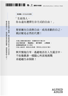 在了解過去的羈絆後,阿德勒一針見血地提醒我們:「沒有不能改變,是人自己決定要不要改變」「生而為人,你永遠有選擇生存方式的自由!」