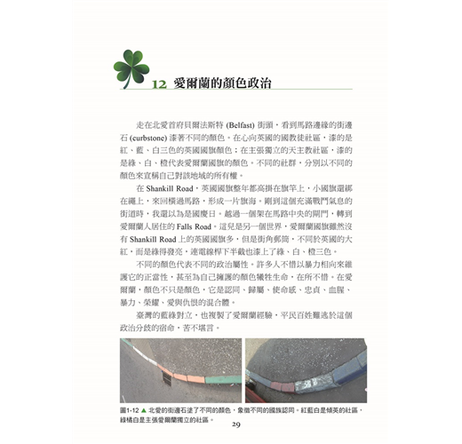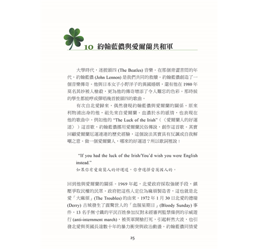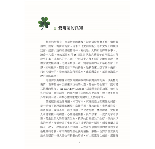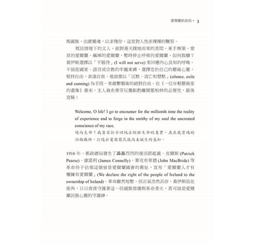 本書內容多元,有愛爾蘭文學、文化、宗教、政治觀察的散文,也有文學作品賞析的小品文,更有多篇針對經典作家喬伊斯的深度論文。透過這些文章,讀者除了可體會到英國殖民統治愛爾蘭八百年的歷史經驗,和了解為何「愛爾蘭人以他們的文學家自豪」;更可從作者丟擲出的問題與批判中,反思你我生活周圍相似的經驗,在揭櫫人性幽暗面的同時,卻又不失幽默。