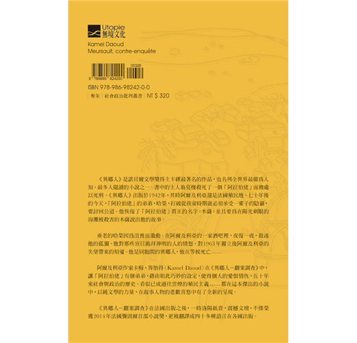 本書為七十年來首部在文學的才情與思想的深度都能與文豪哲學家卡繆的傑作《異鄉人》並駕齊驅的作品,榮獲2015年龔固爾首部小說獎。法國世界報權威書評:「從今以後,《異鄉人》與《異鄉人-翻案調查》必須當做上下冊來閱讀。」