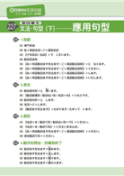 建立好各個詞性的基礎後,本單元以目的別,重新整理所有學過的句型,也就是所謂的橫向歸納。若能熟記縱、橫的要點,不論是何種類型的考題,都可輕鬆應對!