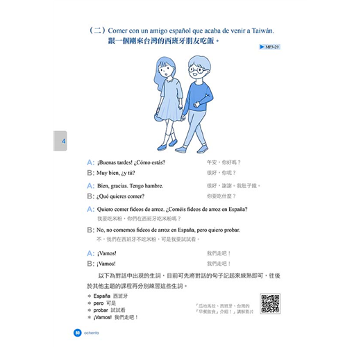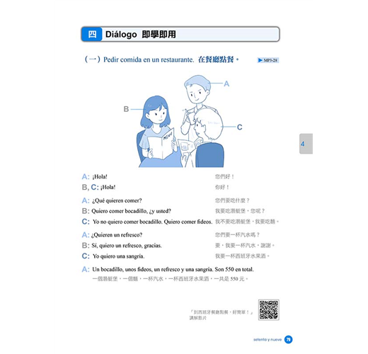 最後,針對只能利用零碎通勤、做家務時間學習的忙碌學習者,特別製作中西對照的雙語錄音檔,一句西語一句中文,讓學習者就算無法拿著書對照,直接聽音檔跟著反覆練習句子和對話,偶爾有空再拿書出來對照,一樣能有不錯的學習效果。