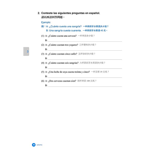 在開始運用西語之前,總要了解一些基礎的生詞。因此在每章的開頭,老師都精選了與該主題相關的實用生詞,用大家常見的外語學習習慣,作為該課的開場與暖身。在生動插圖的搭配下,輕鬆將生詞輸入腦袋裡吧!