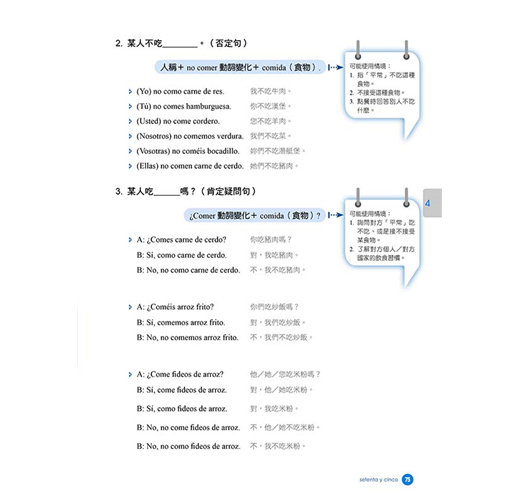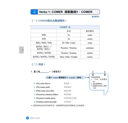 肯定句、否定句、肯定疑問句、否定疑問句,搭配現在式6個動詞變化,每個入門動詞,作者都精心列出多達24句例句,力求每個主題生詞都能在例句中實際運用。除此之外,還有貼心的「可能使用情境」說明,讓你遇到相似情境,腦袋就能自然反應說出得體西語。