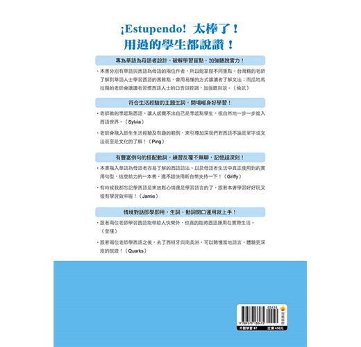 因此在開始教西語之後,我一直都給零起點的學生自編講義,以我自己學習歷程中的體會去揣摩,用怎麼樣的呈現方式,最能讓中文母語的學習者快速吸收。這本教材,在發音、動詞變化、例句編排、主題選擇上,都是融合多年教學經驗之後做出的特殊安排。