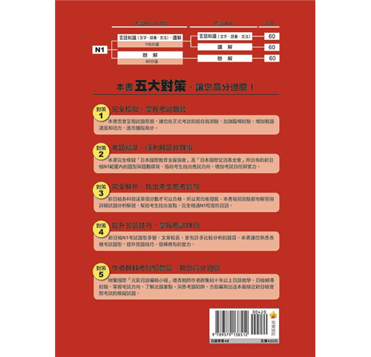 新日檢N1考試題型多變,文章較長,更有許多比較分析的題目,準備不夠充分的話,在考試時往往無法順利寫完所有試題。本書讓您熟悉各種考試題型,提升答題技巧,發揮應有的實力。