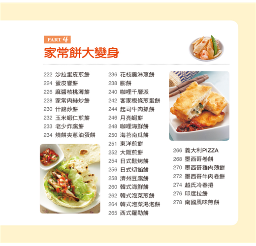 ★ 除一般人氣家常餅外,跳脫傳統,示範炒餅、炸腐餅,異國風味的濟州豆腐餅、韓式海鮮餅、大阪煎餅、墨西哥卷餅、月亮蝦餅、印度拉餅……,提供更多創意和變化。