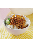2 乾鍋燒熱,放入紅蔥頭及油蔥酥, 小火乾炒至香氣逸出,加入1大匙油,放入絞肉和蝦米續炒3分鐘,移入湯鍋,加入肉燥滷汁大火煮滾,改小火燜煮30分鐘即可,食用時淋在白飯上即可。
