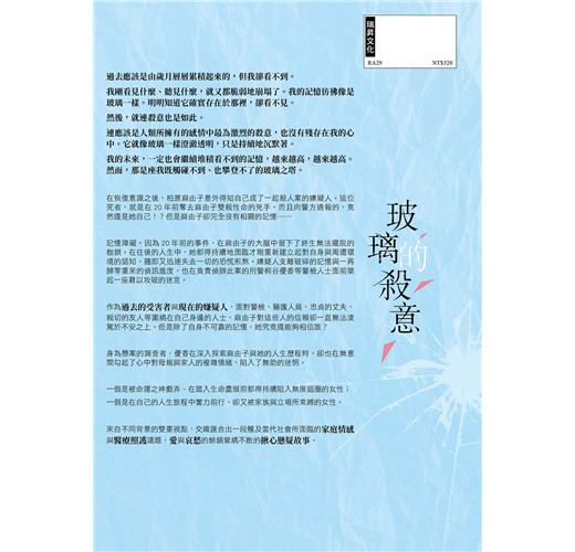 《玻璃的殺意》是一部文筆極具巧思的懸疑作品,讀者在閱讀過程中將會有一種全新的奇妙感官刺激,彷彿自己正寄居於女主角的大腦之中,精準地感受到所謂「記憶障礙」或「老年失智症」患者,在記憶與失憶症狀的切換之際,大腦於感知上所會產生的情緒轉折!作者一...