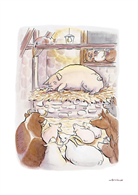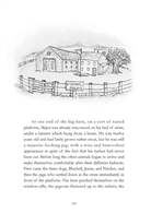 兩匹馬才剛找到位置坐下,一群沒了媽媽的小鴨子排成一列進入了穀倉,輕聲唧唧叫著,尋找合適的落腳處,以防被大動物們踩到。克羅薇伸出前腿當作屏障圈住他們,小鴨子們很快便在裡頭沉沉睡去。白馬莫莉趕在最後一刻忸怩作態地進場,她搖晃著身軀,輕踏著步伐,嘴裡還嚼著一塊糖。她是一匹愚蠢的漂亮母馬,專為瓊斯先生拉座車。她擠到前方賣弄地甩動白色的鬃毛,想吸引大家注意到她那繫在鬃毛辮子上的漂亮紅絲帶。最後進來的是貓,像往常一樣四下張望著找尋最暖和的地方,最後擠在拳師和克羅薇之間。整場演說中她都滿足地發出呼嚕呼嚕的聲音,大豬梅傑說的話,她一個字也沒聽進去。
