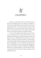 入夜了,曼諾農莊主人瓊斯先生鎖上了雞舍,卻因為喝得太醉而忘了關上小門。他醉醺醺地穿過院子,提燈的光亮隨之左右搖擺。來到家的後門,甩掉了腳上的靴子,逕自進入洗滌室,從酒桶為自己滿上最後一杯啤酒,一飲而盡。接著,便循著瓊斯夫人的酣聲摸上了床。