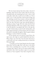 「甚至,我們如此悲慘地生活,還不讓我們安享天年。我是不需為自己抱怨什麼的,畢竟我還算是個幸運的傢伙。我已經十二歲了,有了四百多個子孫。這只是每一頭豬都該享有的正常生活。但是,沒有哪一隻動物最終逃得過刀斧。還有你們,坐在我前方的年輕肉豬們,一年內就會被逼到牆角扯破嗓子叫喊救命。你,拳師,當你老邁無力的時候,瓊斯先生會毫不猶豫地把你賣給屠馬商,你會被殘忍地割斷喉嚨,你的肉會被熬煮成獵狐犬的食物。狗也無法僥倖逃過,當他們年邁衰老、牙齒掉光時,瓊斯先生會在他們的脖子上繫上磚頭,把他們溺死在最近的湖裡。