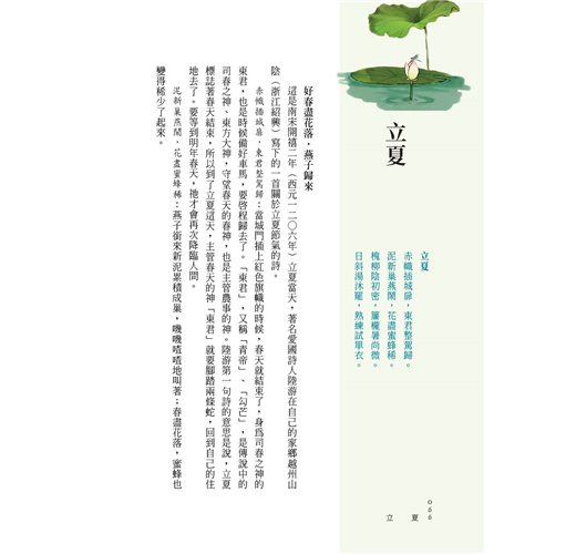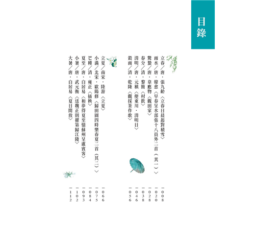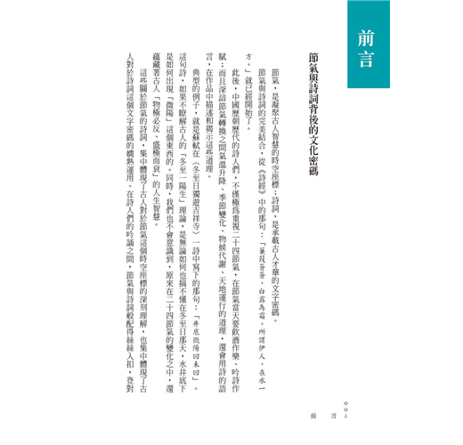 本書既有通俗易懂的詩詞釋義,亦有生動有趣的詩人故事,並講述了節氣的來源及習俗,讓讀者能輕鬆理解節氣與詩詞背後的歷史文化。