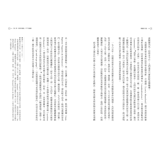 時鐘與精準的關聯也許不難想像,但我們也會在書中讀到其他意外的故事。比如溫契斯特告訴我們,「精密」的誕生,與瓦特發明蒸汽機竟也有著直接的關連。原來,瓦特早期所製造的蒸汽機。因為不夠精密,蒸汽一直外洩,讓雄心勃勃的瓦特懊惱不已。幸好,來自英國的「鐵狂人」威爾金森(John Wilksinson),在因緣際會下與瓦特搭上了線,並以他製造火砲的經驗,改善瓦特的蒸汽機,消除了蒸氣外洩的問題,也讓瓦特發明的機器,開始推動歷史轉軸。過去歷史課本講到工業革命,絕對不能不提瓦特之名,但意外扮演關鍵推手的威爾金森,可就沒那麼為人所熟知了。