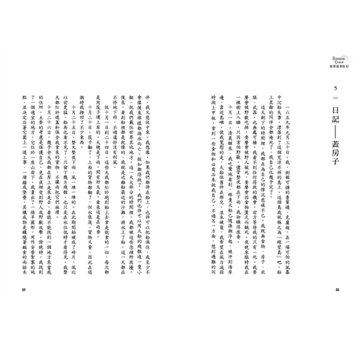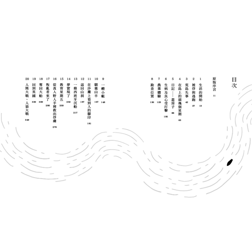 一六五九年九月三十日。我,倒楣可憐的魯賓遜.克盧梭,在一場可怕的風暴中沉船失事,漂落到了這個荒涼不祥的島上。這個島我就稱之為「絕望島」吧。船上其餘的同伴全都淹死了,我自己也幾乎完了。