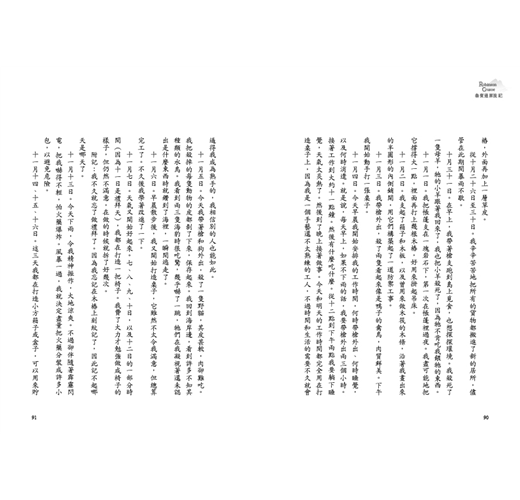 為了生存,他並不自怨自艾,而是努力尋找身邊的資源,安營紮寨、製桌造椅、種植農作、生產麵包、圈養山羊,從無到有,打造自己的王國,憑藉強大的信念一次次度過難關,並藉由書寫日記,與自我對話、理清頭緒,最後終於獲得生路,結束長達28年的荒島歷險記。
