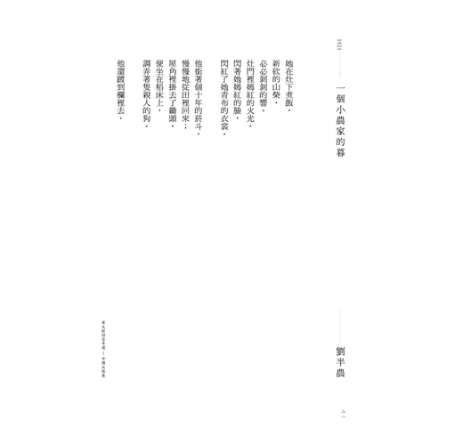 《華文新詩百年選‧中國大陸卷》計分兩冊,共收錄八十二位中國詩人的作品,百年光景,融於一爐。本冊以俞平伯一九一八年發表的〈冬夜之公園〉起卷,二○年代有第一個向西方象徵派借火的初期象徵派詩人李金髮,以及詩人最多、聲勢最大的新月派。三○、四○年代的現代派詩群,何其芳、艾青、穆旦、馮至、臧克家等都是重要詩人。五○及六○年代走向現實和寫實主義,出現許多長篇敘事詩。到了文革時期,詩人不公開地寫作,「地下詩歌」成為苦悶心靈的出口。文革之後,從七○年代後半到80年代的朦朧派,堪稱爭議最多、影響最大、最深遠的詩歌流派,他們表達出對社會陰暗面的不滿與鄙棄,北島、顧城、江河、楊煉、舒婷、海子、西川等都是具代表性作家。