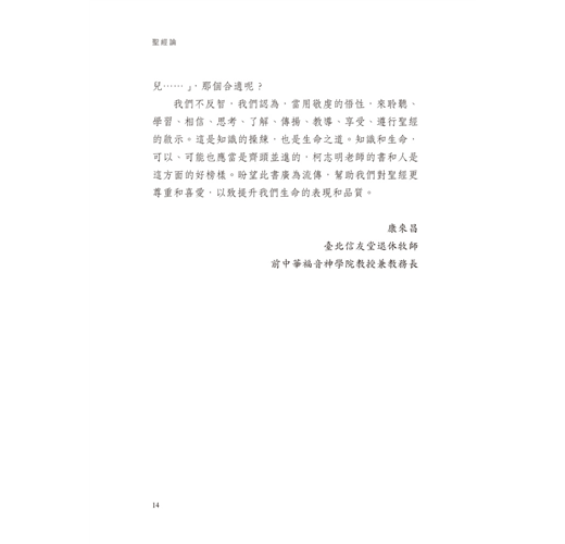 透過作者熟練的知識操練與通達的生命之道,讓讀者在閱讀中使知識和生命齊頭並進,透過此書更可幫助我們對聖經更尊重和喜愛。