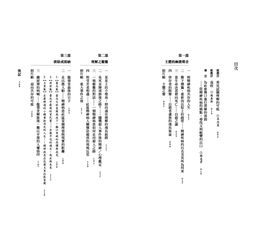 1. 本書的內容章節以同心圓的方式安排,第一部份「主體的幽微聲音」,就是以精神疾病為中心,來鋪排患者的自述,以及醫療與社工體系、親友家屬等的心聲。