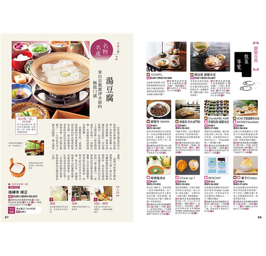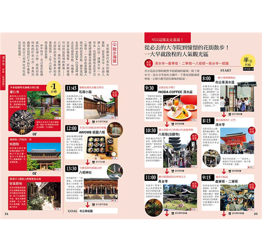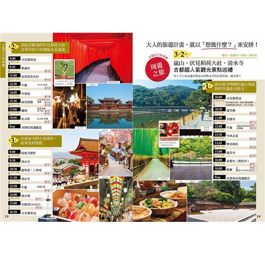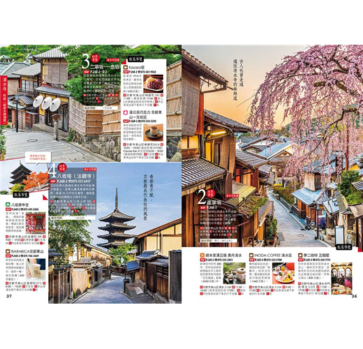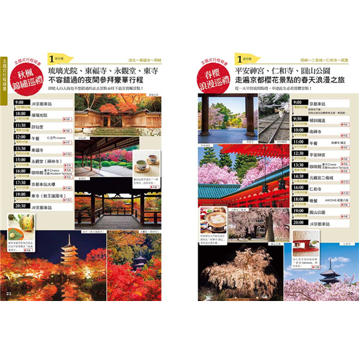 本書針對各區域,貼心規劃不同旅遊行程:你可以利用三天兩夜,走遍古都超人氣景點;在平安神宮、仁和寺、圓山公園展開一整天的春櫻爛漫巡禮;若想到訪時下最夯賞楓景點,可規劃從早到晚的紅葉名所行程。當然,如果你想分區遨遊,每個區域都有詳細的一天或半日行程可供參考。