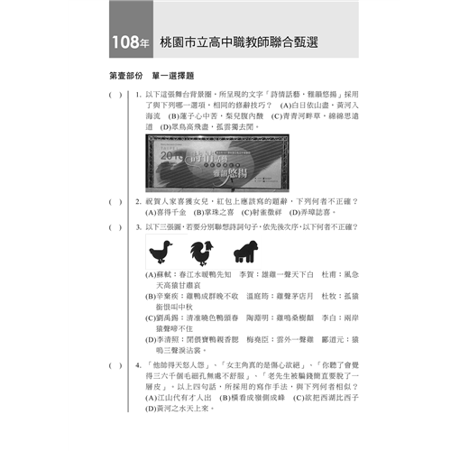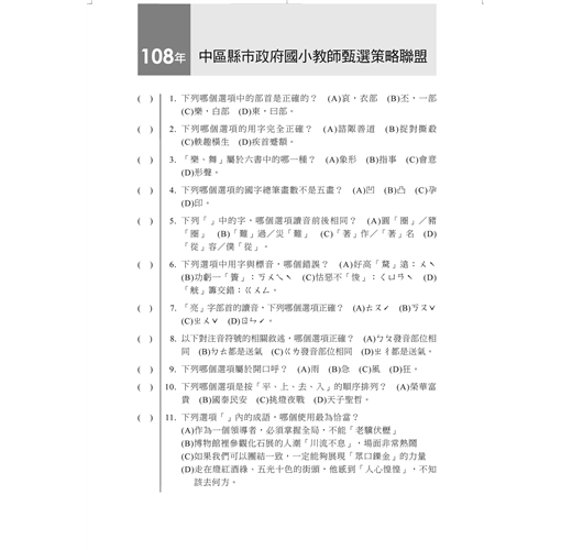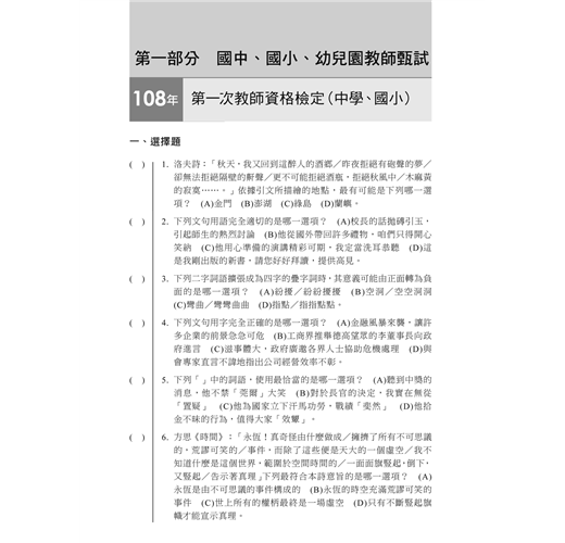 傳統上對於國字注音、改錯和成語的題目仍會出現,這是基本門檻,測試老師們是否能掌握較生僻、易讀錯的字詞、字音,雖占比分不高,但仍是基本題,這要透過平時累積,慢慢熟記更要盡力答對。